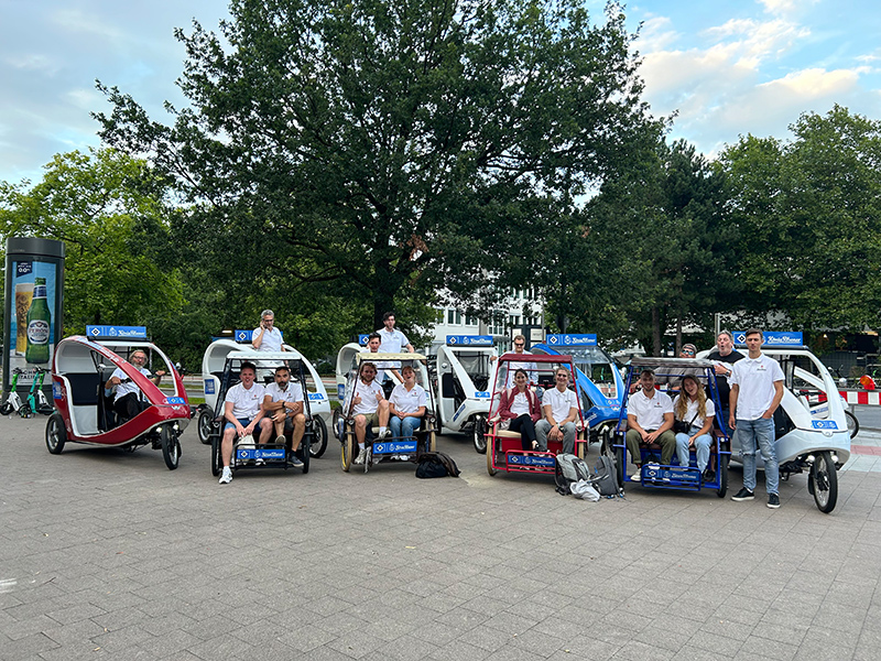 Einerseits, um schnell und mit Frischluft von A nach B zu gelangen, andererseits um mit uns die Vorzüge der Hybridmobilität (Strom- und Müsli-Power) schätzen zu lernen. Bei einer speziellen Taxifahrt, einer Stadtsafari, Sightseeing-Tour – mit oder ohne (Stadt-)Führung.